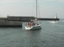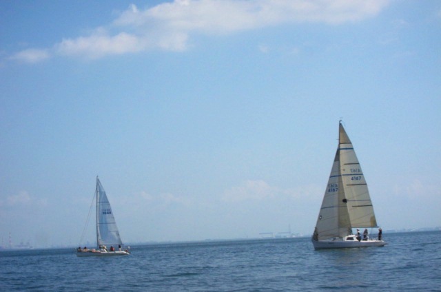 鬼崎側では、白波が出るほどの良い風が、終日吹いていたそうですが、四日市港入口は、スタートの10:30を迎える頃には、ドンドン落ち、先行の<フォルテ><ケリーダ>を除き、前日の雨による川の流れと引き潮、そして落ちていく風に翻弄され、第一マークへの半分位で、各艇漂っている状態でした。