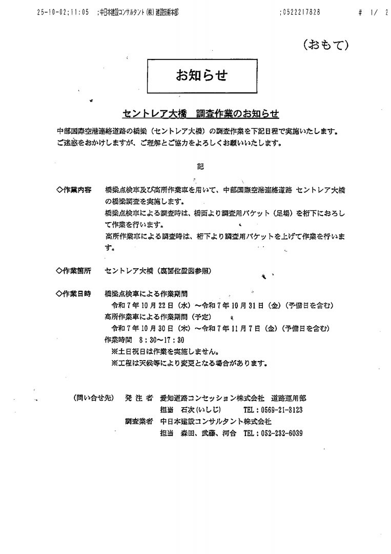 下記の様に、セントレア大橋にて調査作業が行われます。(添付資料参照願います) 橋桁下に作業用足場が下げての作業もありますので、 この期間は橋下の通過はできる限り避けていただけますよう、お願いいたします。