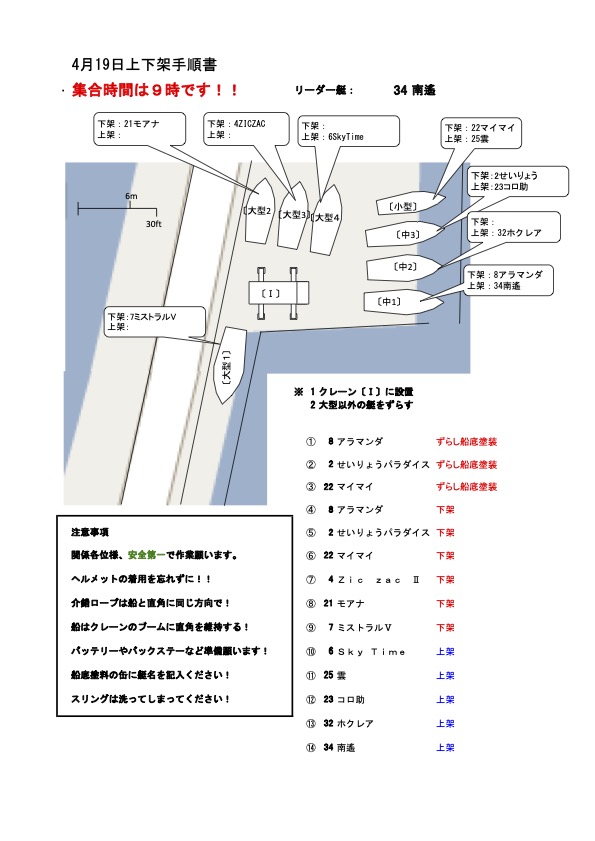 4月19日(日)上下架作業手順書送付します。 当日は9時集合でお願いします。 リーダー艇は南遙で当日点呼、注意事項周知実施お願いします。 今年度からヘルメットは保管場所をクラブハウス1階から倉庫内に移動しました。 ヘルメット10個を2つの緑色のバッグに5個ずつ入れてあります。 安全第一での作業よろしくお願いします。 手順書の印刷は各自でよろしくお願いします。