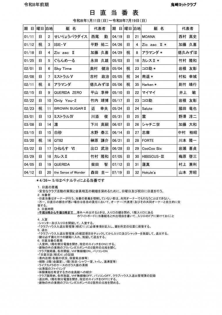 鬼崎ヨットクラブ » 日直当番表